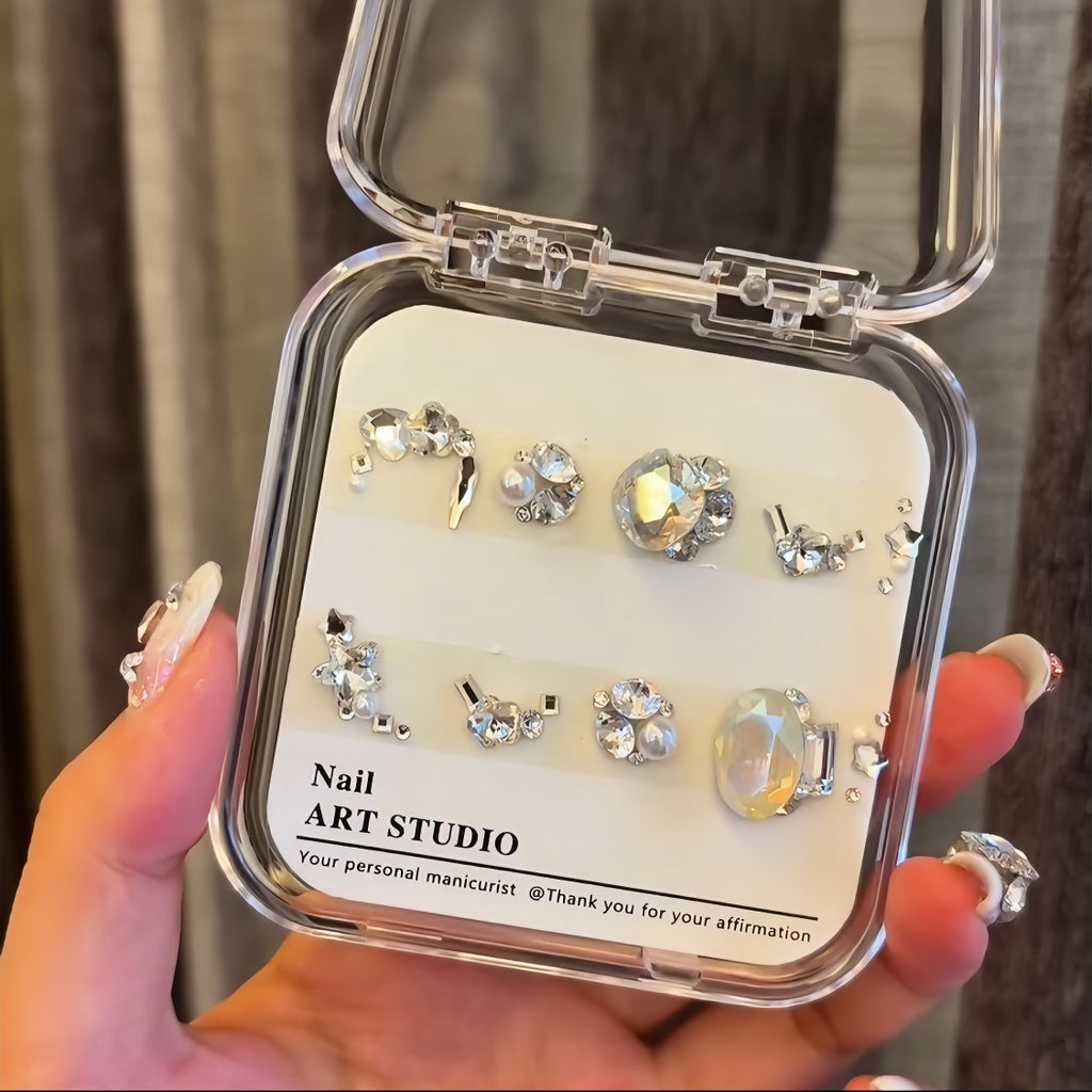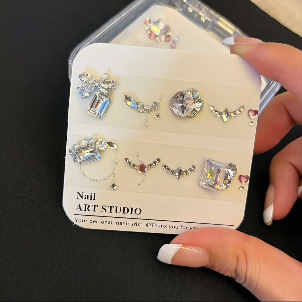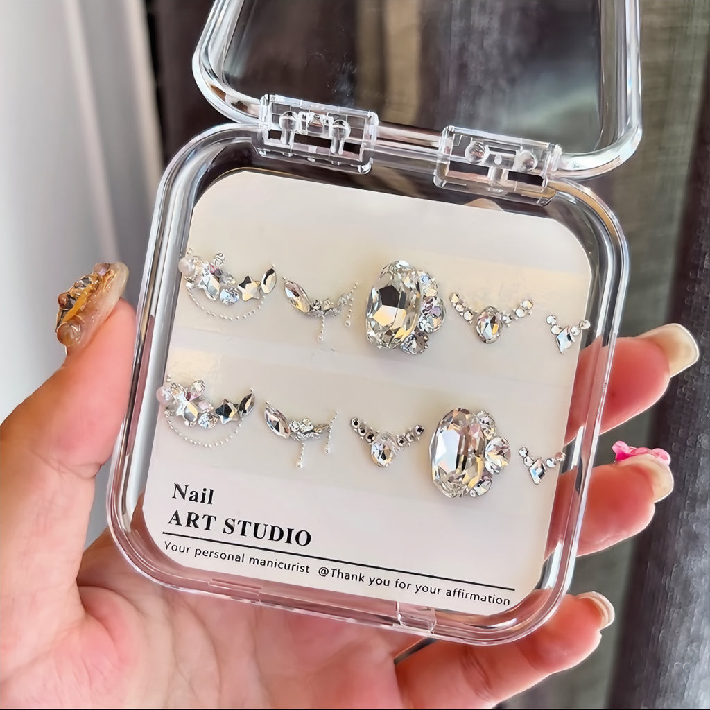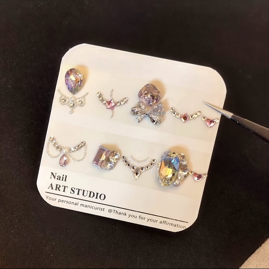Our DIY diamond material package sets are all handmade. After purchasing, you'll need to use tweezers to pick them out one by one, and then replicate the pre-made designs onto your own nails.